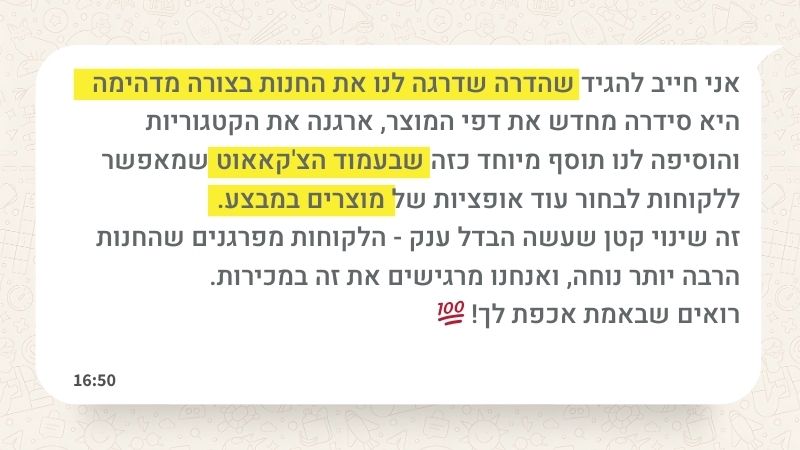 התאמה אישית מלאה: כל חנות היא סיפור אחר ואני בונה יחד איתך פתרון מותאם שמדויק לצרכים של החנות שלך.