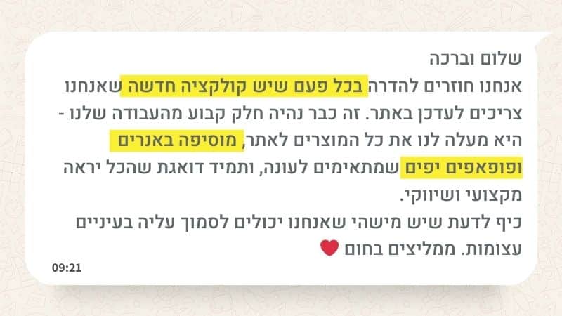 אני מאמינה בשקיפות מלאה. כל פעולה שאני מבצעת מתועדת בגוגל שיטס משותף שבו אפשר לראות בכל רגע מה כבר בוצע ומה נמצא בתהליך. זה הופך את שיתוף הפעולה למסודר, ברור ונוח בלי הפתעות. בנוסף, זה נותן תחושת שליטה וביטחון שהחנות שלך מתנהלת כמו שצריך, גם כשאני עושה את העבודה עבורך.